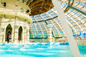 Тропический аквапарк с бассейнами, горками и СПА-зоной. Хороший вариант для зимнего дня рождения — дети смогут веселиться в воде, а родители отдохнуть в термальных зонах.